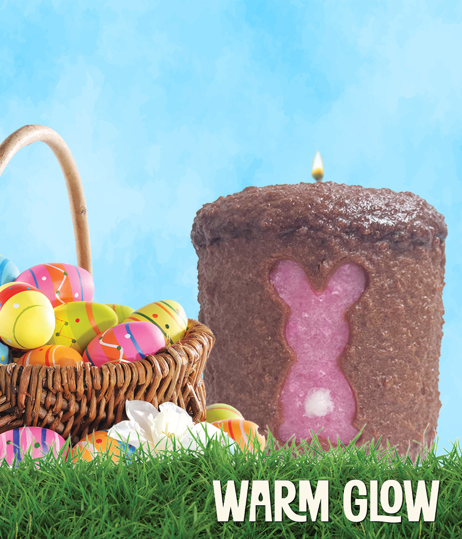 Calorie-free chocolate bunnies are finally here! Meet our new Bunny cutout Hearth candle in rich, chocolate fragrance, milk chocolate colored overdip on candy colored pink core – complete with fluffy puff “cotton” tail.